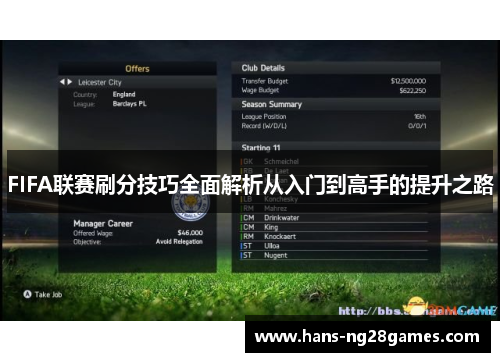 本文将全面解析FIFA联赛刷分技巧,从入门到高手的提升之路,帮助玩家们逐步掌握高效刷分的方法。FIFA联赛作为一款竞争激烈的足球游戏,玩家不仅需要了解游戏机制,还需掌握一些刷分技巧才能在比赛中脱颖而出。文章将从四个方面详细阐述刷分的核心要素:理解游戏机制与规则、提高技术水平、掌握队伍构建与策略、利用比赛内外因素提升分数。每个方面都将提供具体的技巧和建议,帮助玩家们不断进步,最终成为FIFA联赛的高手。本文适合所有FIFA联赛玩家,尤其是那些希望通过不断刷分提高竞技水平的玩家。